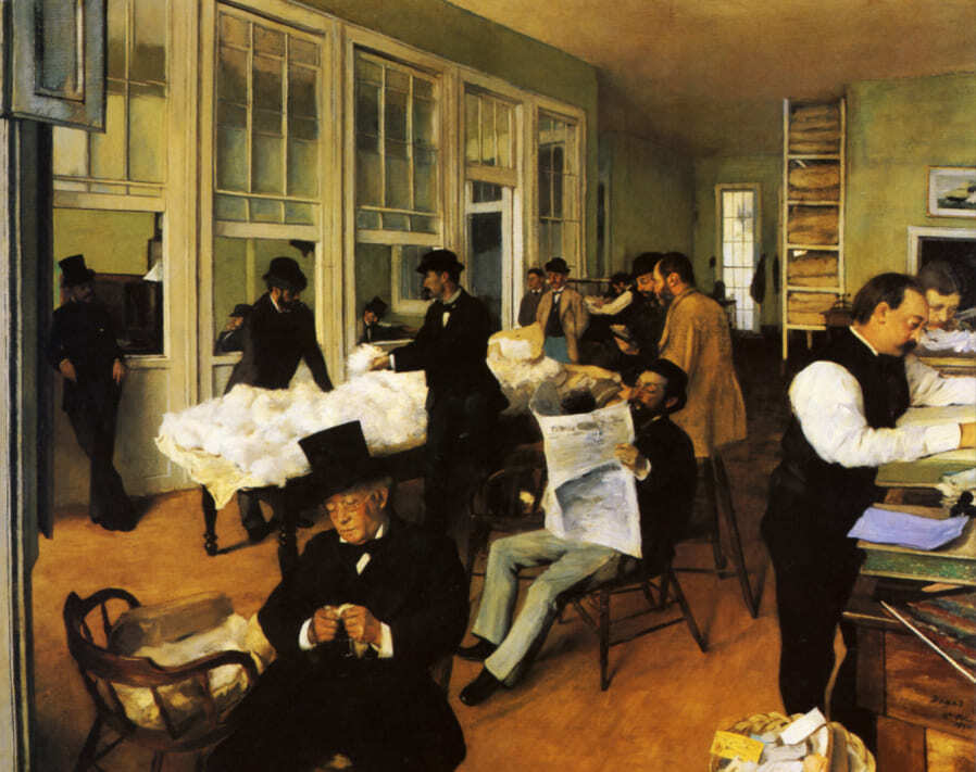 Сделан акцент на сильном контрасте между черными костюмами служащих и белым цветом рубашек, бумаг и, особенно, хлопка. В композиции нет ничего случайного, а приподнятая перспектива позволила расширить довольно тесные границы офиса, чтобы вместить четырнадцать человек за различной работой, не слишком их тесня.